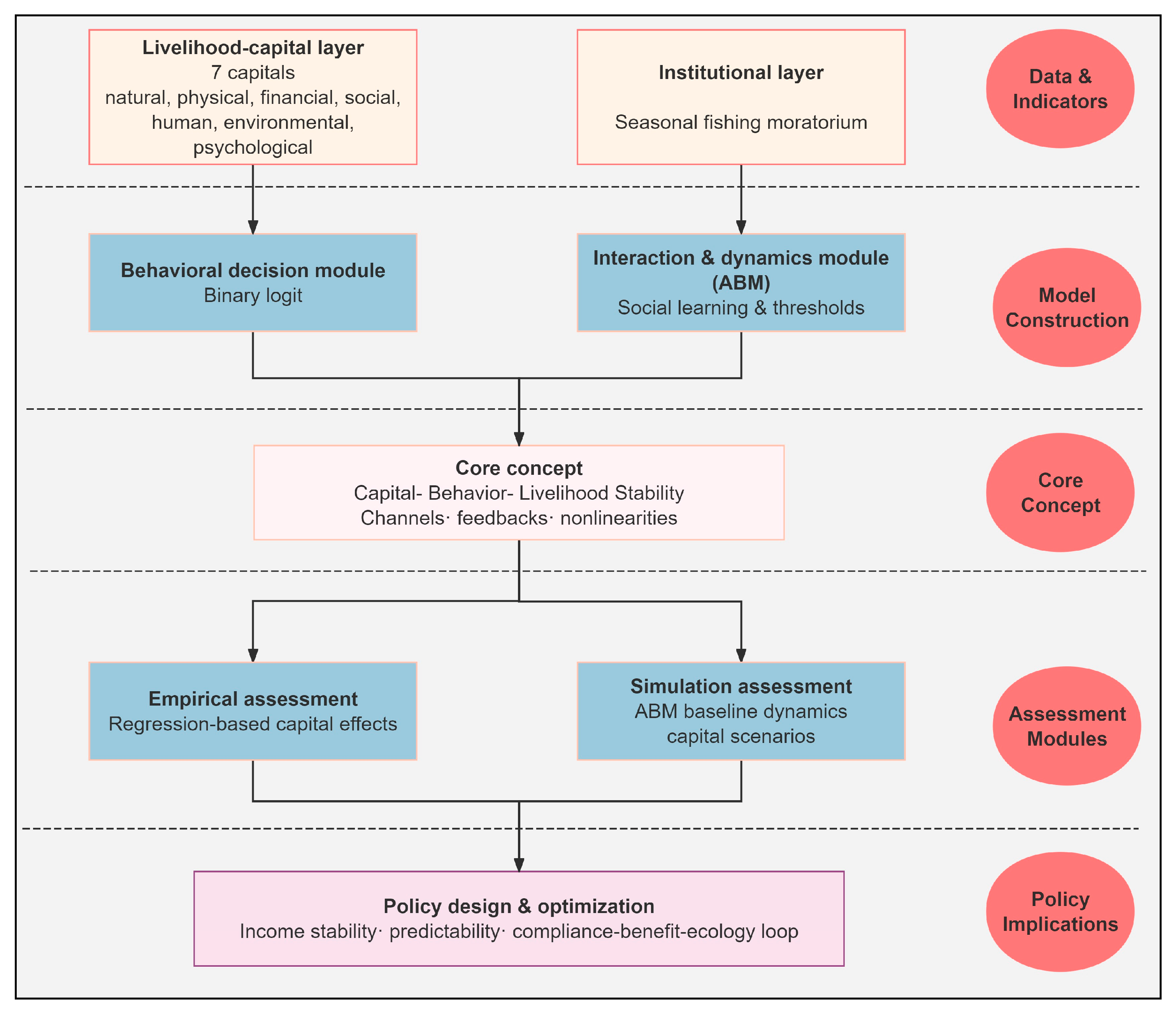 | Dependent Variable | LD | Main Livelihood—Fishing | Primary livelihood status is defined by a majority income-share criterion, with the 60% threshold chosen to match the instrument’s 20% bands and to prevent borderline 50% recall issues | 584 | 0.414 |
