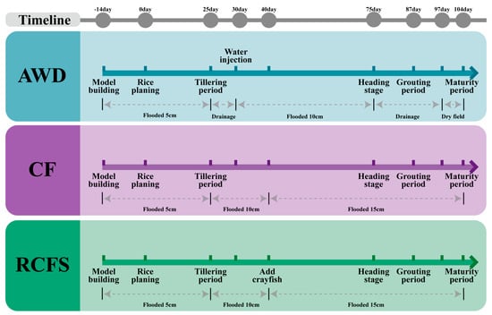 In the RCFS and CF treatments, fields were continuously flooded throughout the rice-growing season. Water depth was maintained at approximately 5 cm at transplanting, increased to ~10 cm during the tillering stage, and further increased to ~15 cm from the heading stage until maturity. In the AWD treatment, water management followed a phenology-based alternating wet–dry cycle. After transplanting, a 5 cm water layer was maintained. During the tillering stage (around 25 d), the field was allowed to drain naturally until the soil surface became dry, after which it was reflooded to ~10 cm during subsequent stem elongation, jointing, and booting stages (around 30 d). A second drying phase occurred after heading (around 75 d), during which the field was kept dry throughout the grain-filling period (87–97 d). Final drainage occurred 15 days before harvest to facilitate grain maturation (Figure 1).