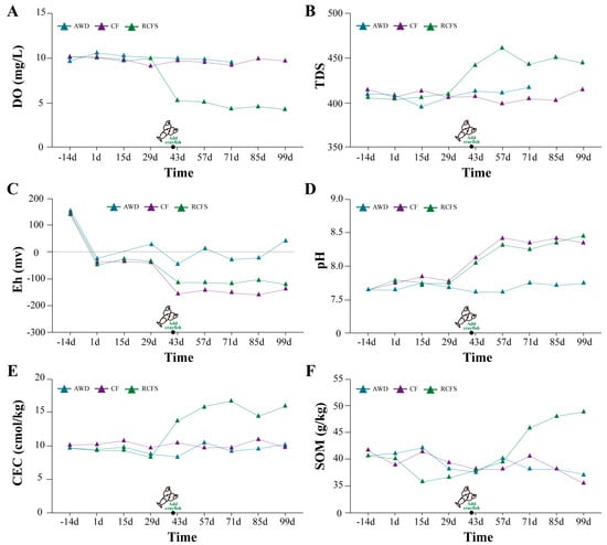The soil CEC in the AWD and CF was relatively smooth, while in the RCFS, it rose rapidly after 43 days and then remained between 14 and 16 cmol/kg, which was significantly higher than that in the AWD and CF (p < 0.05) (Figure 2E).