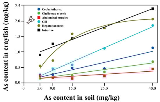 Regression equation of arsenic content in crayfish tissues and soil arsenic concentration.
