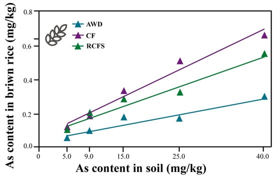 The arsenic content of brown rice in the three modes in relation to the arsenic content of the soil was determined using the following equations: RCFS: y = 0.0117x + 0.0598 (R2 = 0.9600), CF: y = 0.0159x + 0.0532 (R2 = 0.9729), and AWD: y = 0.0063x + 0.0332 (R2 = 0.9116). According to the (GB2762-2022 National Standard for Food Safety Limits of Contaminants in Food) inorganic arsenic threshold (0.2 mg/kg) for brown rice, soil arsenic safety thresholds were extrapolated as 11.98 mg/kg, 9.24 mg/kg, and 26.48 mg/kg for RCFS, CF, and AWD, respectively (Figure 4).