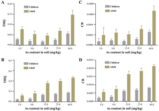 Under the same soil arsenic contamination conditions, the non-carcinogenic and carcinogenic risks of crayfish tissues to adults and children were positively correlated with soil arsenic concentrations. Hepatopancreas non-carcinogenic risk and carcinogenic risk were higher than in abdominal muscles. In the 40 mg/kg treatment group, the non-carcinogenic risk of abdominal muscle and hepatopancreas (Figure 5A,B) did not exceed the guideline values. For children, the carcinogenic risk of the abdominal muscle of crayfish did not exceed 10−4 at any soil arsenic concentration lower than 15.0 mg/kg, but when the soil arsenic concentration reached 25.0 mg/kg, the carcinogenic risk of the abdominal muscle was 1.2 × 10−4 > 1 × 10−4 (Figure 5C); the carcinogenic risk of the hepatopancreas of crayfish already reached 3.17 × 10−4, even in low-concentration conditions (Figure 5D), indicating that the hepatopancreas of crayfish is a potential carcinogenic risk for children. For adults, the carcinogenic risk due to abdominal muscle and hepatopancreas exceeded 10−4 at a soil arsenic concentration of 5.0 mg/kg (Figure 5C,D), suggesting that crayfish produced in the RCFS poses a potential carcinogenic risk to adults.