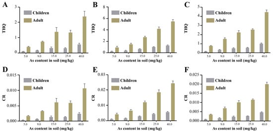 The non-carcinogenic risk of brown rice for both children and adults was positively correlated with soil arsenic concentration and showed a trend of CF > RCFS > AWD. At the same soil arsenic concentration, the non-carcinogenic risk of adults was higher than that of children. In the AWD (Figure 6A), the non-carcinogenic risk of brown rice for children was below the guideline value of 1 in all cases, while the non-carcinogenic risk for adults was 1.37 at a soil arsenic concentration of 15 mg/kg. In the CF (Figure 6B) and RCFS (Figure 6C), the non-carcinogenic risk of brown rice for children was 1.53 and 1.03 only under high contamination conditions (40 mg/kg), while the non-carcinogenic risk for adults was 1.44 and 1.53, respectively, at a soil arsenic concentration of 9 mg/kg. In all three models, the carcinogenic risk of brown rice to children and adults was positively correlated with the soil arsenic concentration and showed a trend of CF > RCFS > AWD (Figure 6D–F). Carcinogenic risk was higher in adults than in children at all the same soil arsenic concentrations. The carcinogenic risk exceeded 10−4 at all concentrations in all three models.