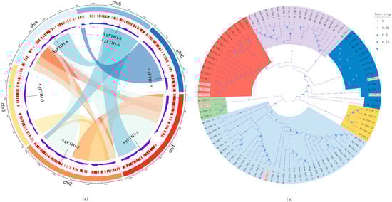 Chromosomal locations were determined from the genome GFF3 annotation file and visualized using Circos. Analysis revealed a relatively uniform distribution of the AgFTH1 gene across 6 chromosomes (Chr1–Chr6) (Figure 1a): Chromosome 5 contained 2 tandemly arranged genes (AgFTH1-5 and AgFTH1-6), while the remaining chromosomes each harbored a single gene. This pattern indicates that local duplication events drove the evolution of the AgFTH1 gene family and provides a foundation for exploring potential links between chromosomal architecture and gene regulatory mechanisms.