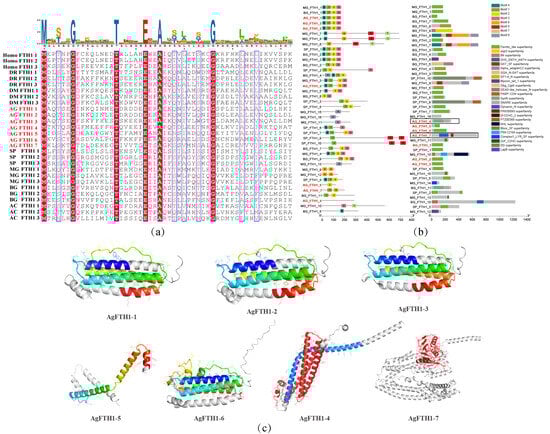 Structural and functional characteristics of the FTH1 protein in A. granosa (a) Multiple sequence alignment of FTH1 proteins from A. granosa and representative vertebrate and invertebrate species. Highlighted are conserved residues within the ferritin heavy chain domain, including key hemochrome active site residues. (b) Distribution diagram of conserved motifs and domains in FTH1 proteins from A. granosa and other species, in which the domain-lacking AgFTH1-4 and AgFTH1-7 are marked with black boxes. (c) Three-dimensional structure visualization of the A. granosa FTH1 protein, with colored regions indicating ferritin domain segments. In AgFTH1-4, the red portion denotes the Syntaxin N-terminal/SNARE motif characterized by extended α-helices; whereas in AgFTH1-7, the Dynamin domain is highlighted in red.