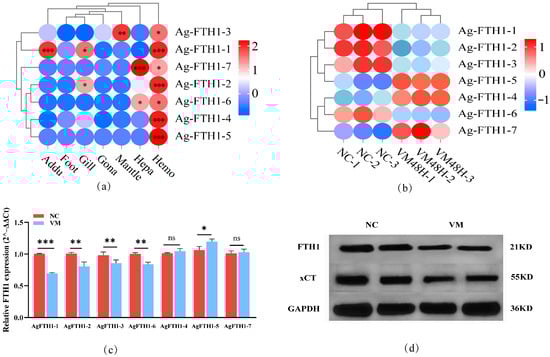 Expression analysis of FTH1 genes in A. granosa (a) Heatmap showing AgFTH1 transcript abundance across different tissues (adductor muscle, foot, hepatopancreas, gill, mantle, gonad, and hemocytes), with color gradients representing expression levels; * p > 0.05, ** p < 0.01, *** p < 0.001. (b) Transcriptome analysis showing the transcript levels of AgFTH1 paralogs in hemocytes following Vibrio exposure. (c) qRT-PCR validation of AgFTH1 expression. Bar plots depict the relative expression of 7 AgFTH1 genes in Vibrio-infected clams (VM 48 h) negative control (non-infected clams) (NC). ** p < 0.01, *** p < 0.001. ns: no statistically significant changes (* p > 0.05). (d) Western blot analysis was performed on lysed blood cells using primary antibodies against FTH1, xCT, and GAPDH. Semi-quantitative analysis of the blotted bands was conducted, with relative band intensities normalized against GAPDH as a reference; n = 3 biological replicates. NC negative control (non-infected clams), while VM represents the vibrio-induced stress group.