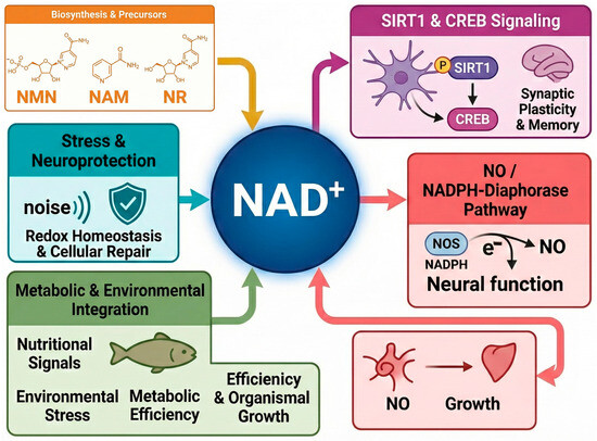 Schematic representation illustrating the central role of NAD+ metabolism as a key component of a network that links metabolism, neuronal function, and environmental responsiveness in teleosts. NAD+ acts as a critical hub connecting 1. Dietary precursor availability. 2. Regulation of synaptic plasticity and memory through activation of sirtuins (SIRT1) and transcription factors such as CREB. 3. Nitric oxide (NO) synthesis, a key signaling molecule, via the NADPH-diaphorase (NOS) enzyme, relies on NAD+-derived cofactor (NADPH). NO mediates processes such as neurotransmission and vasoregulation. 4. Protective mechanisms against external stressors, such as acoustic stress, maintain redox homeostasis and promote cellular repair. 5. Integration of nutritional and environmental signals to regulate metabolic efficiency and organismal growth.