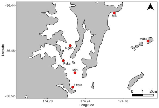 To examine potential spatial differences in restoration success within estuarine ecosystem, six sites were established along an estuarine environmental gradient from the inner Mahurangi Harbour in the Hauraki Gulf to the outer channel (Figure 1). The Mahurangi Harbour is a small estuary (25 km2), consisting of a drowned river valley system that is relatively sheltered from ocean swells due to the orientation of the harbour entrance, with additional protection provided by coastal islands at the entrance to the harbour [46,47,50,51,52,53,54,55]. The estuary is one of the most studied estuarine ecosystems in New Zealand with clear estuarine environmental gradients in shelter, sedimentation and salinity from its source in the Mahurangi River to its entrance out into the Hauraki Gulf [46,47,50,51,52,53,54,55]. Four of the study sites were located within the harbour, with those sites increasingly closer to the harbour entrance decreasing in benthic fine sediment and turbidity [46,47,50,53,54,55]. The remaining two sites were established on the coastline beyond the harbour entrance and continued the trend of decreasing benthic fine sediment in the series of sites running up the harbour. The sea floor topography at each site consisted of a flat or gently sloping substrate at depths of 5 m below mean low water (tidal fluctuations of approximately 2 m) and within 200 m of the low tide mark of the adjacent shoreline. While depth was relatively constant among sites, variability in environmental conditions within this span of the estuary has been documented historically for salinity (31–35 ppt), peak surface water velocity (during ebb tides of 0.15 to 0.5 m s−1), and turbidity (approximately 0 to 6 NTU with greater turbidity within the estuary) [50,53,54].