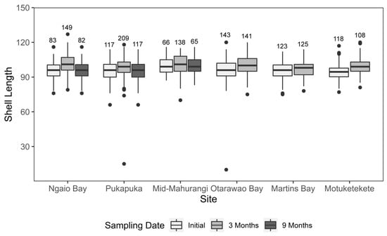 There was a significant interaction between site and sampling date when comparing mussel SL up to the 3 month sampling (F = 2.32, df = 5, p = 0.041, Table 1, Figure 4). Pairwise comparisons revealed that initially there were no significant differences in SL between sites except at mid-Mahurangi, where the mean SL was 3.14 mm larger than any other site (Figure 3). Comparisons of mean SL at 3 months indicated no significant changes in SL for mid-Mahurangi and Martins Bay compared to their initial size, while all other sites exhibited significant increases in SL of 2.95–5.28 mm over that sampling date. The analysis using only those sites that could be sampled at 9 months (mid-Mahurangi, Ngaio, Pukapuka) exhibited no interaction between experimental factors (F = 1.74, df = 4, p = 0.140, Table 2) and significant effects of both site and sampling date (F = 15.31, df = 2, p < 0.001 and F = 21.36, df = 2, p < 0.001, Table 2). Pairwise comparisons revealed that for those three sites, while the mean SL of mussels varied at 3 months from the initial size, there were no significant differences in SL between 9 months and the initial sampling (Figure 4).