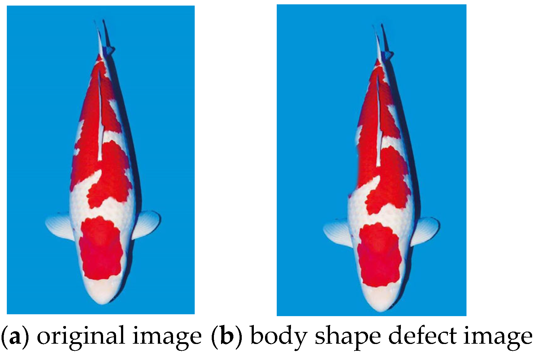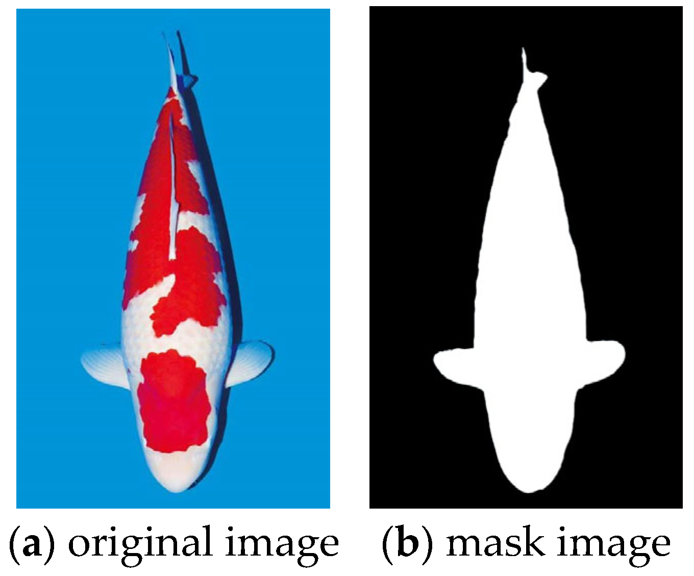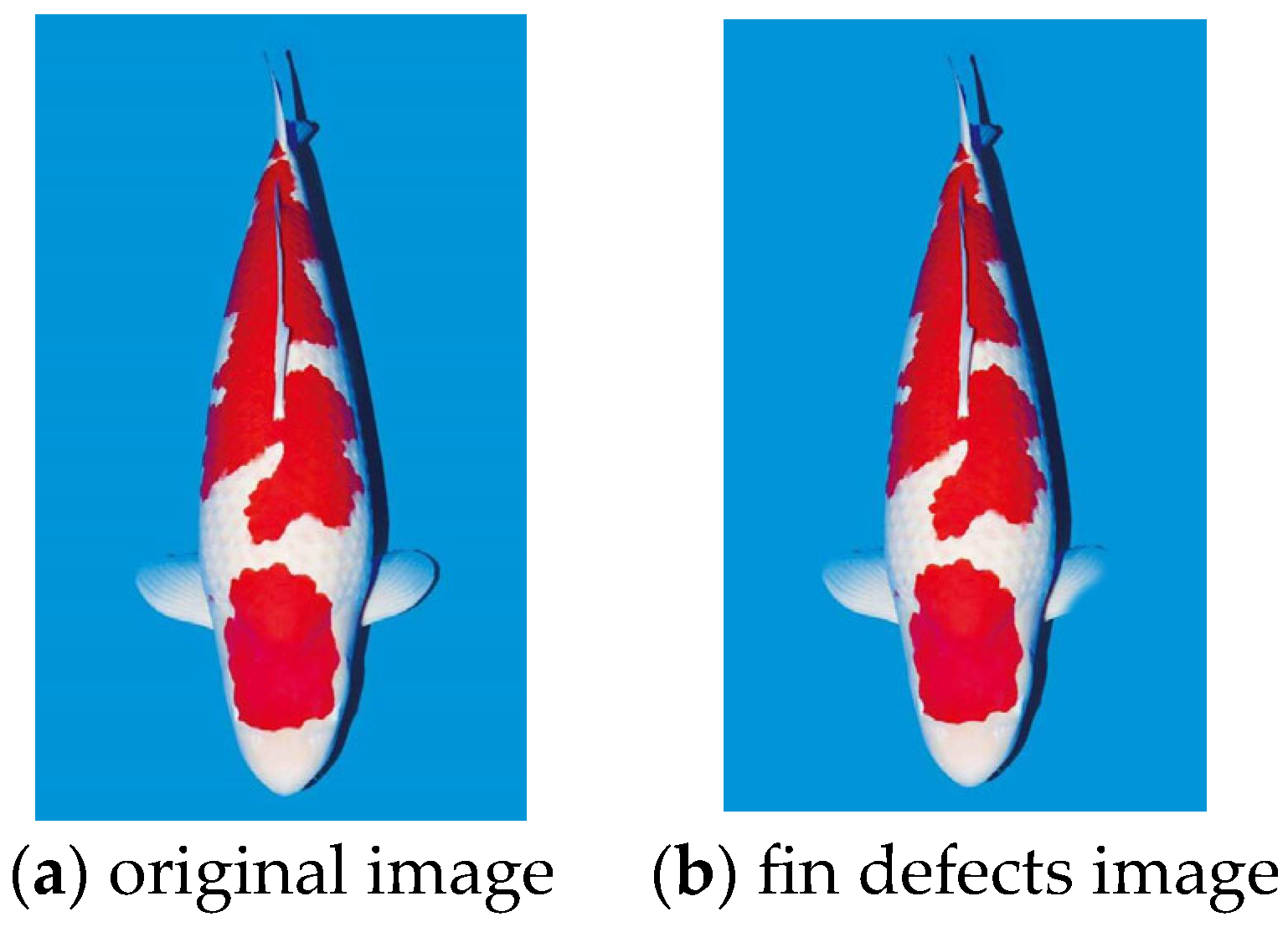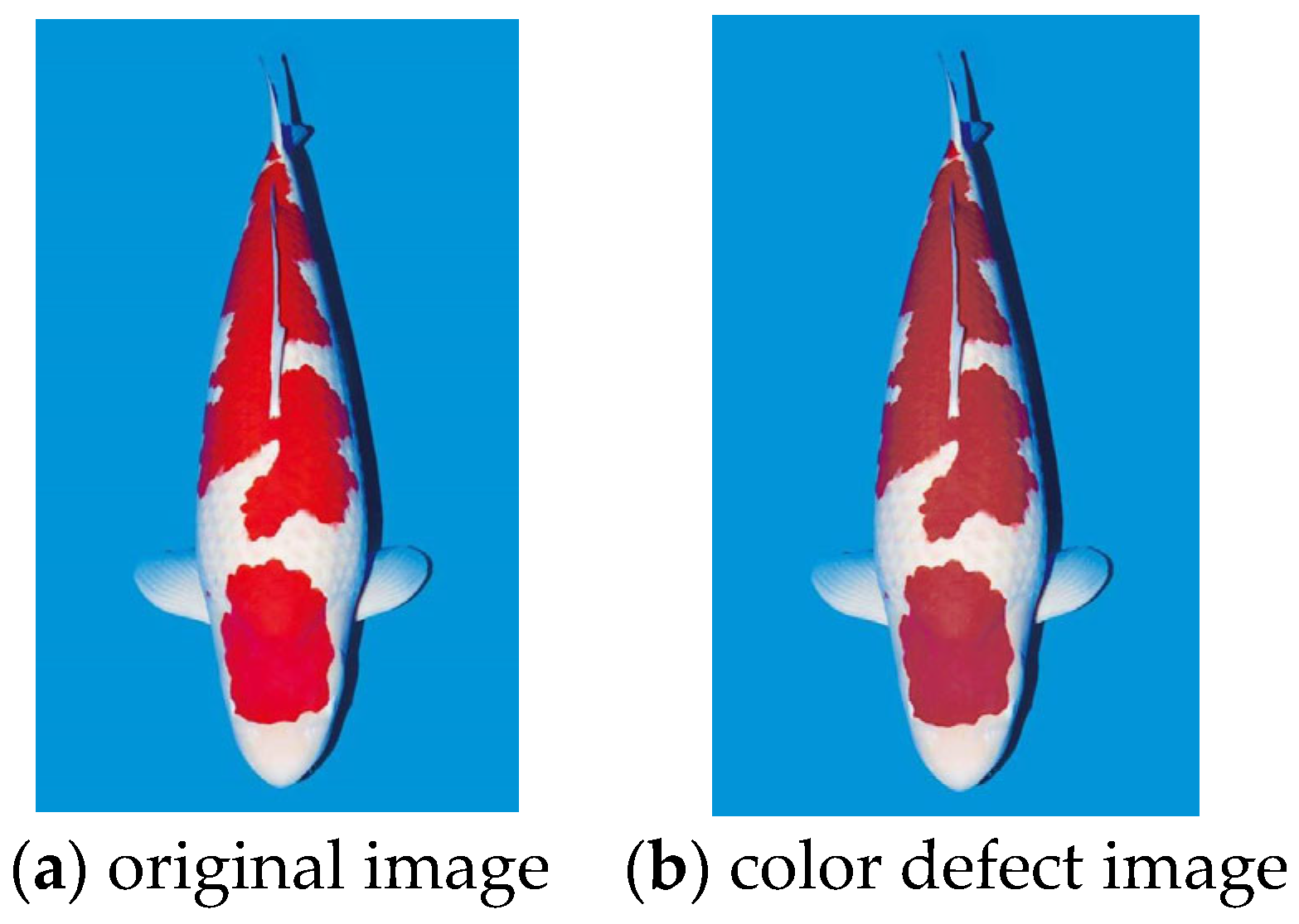 - Domasevich, M.A.; Hasegawa, H.; Yamazaki, T. Quality Evaluation of Kohaku Koi (Cyprinus rubrofuscus) Using Image Analysis. Fishes 2022, 7, 158. [Google Scholar] [CrossRef]