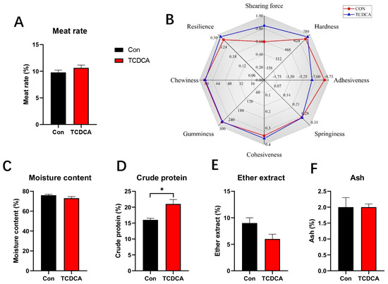 The effects of TCDCA on muscle texture and nutrient content of P. clarkii. (A), meat rate; (B), radar map on muscle texture; (C), moisture content; (D), crude protein; (E), ether extract (crude lipid); (F), ash. Data were analyzed by Student’s t-test; * represent p < 0.05, results are indicated as mean ± SEM, n = 9.