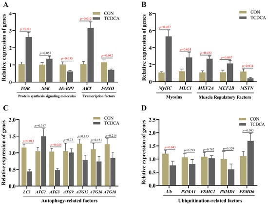 Effects of TCDCA on the transcription levels of genes related to muscle development in P. clarkii. (A), relative expression of genes related to protein synthesis signaling molecules and transcription factors; (B), relative expression of genes related to myosin and muscle regulatory factors; (C), relative expression of genes related to autophagy factors; (D), relative expression of genes related to ubiquitination factors. Red data mean p < 0.05.