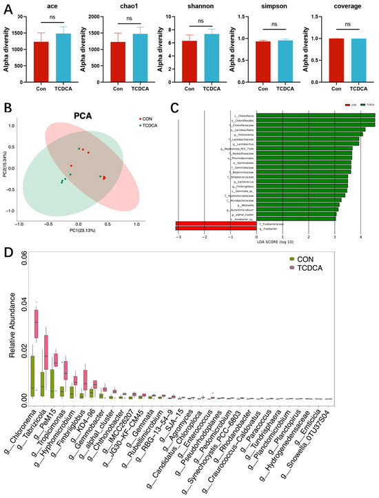 Intestinal microbes between Con and TCDCA groups in P. clarkia. (A), alpha diversity analysis, ns represent p > 0.05; (B), Principal Component Analysis (PCA); (C), microbial community biomarkers: LEfSe analysis identified the taxa with the most remarkable differences in abundance among the three taxa; (D), microbial comparation analysis between Con and TCDCA groups at the genus level. In (C,D), “c_, o_, f_, g_, s_” are the prefixes of the bacteria.
