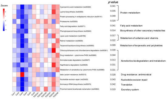The prediction of the function of intestinal microorganisms by KEGG function analysis is shown in Figure 5. The function prediction showed that the TDCDA group increased the abundance of metabolism pathways (protein metabolism, fatty acid metabolism, biosynthesis of metabolites, metabolism of cofactors and vitamins, xenobiotic biodegradation and metabolism, and nucleic acid metabolism) and excretory system. However, TCDCA decreased the abundance of drug resistance (beta-Lactam resistance). Therefore, TCDCA modified the gut flora to boost metabolism.