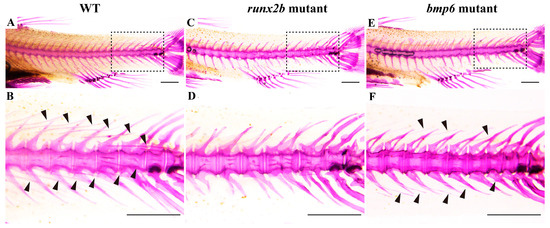 Alizarin red S staining was used to detect intermuscular bones of the WT fish and runx2b, bmp6 mutants at 90 daf. Compared to the WT fish (Figure 5A,B), intermuscular bones were reduced or even absent in the runx2b (Figure 5C,D) and bmp6 (Figure 5E,F) mutants.
