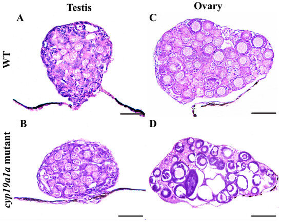 Gonadal histology analysis was performed for both WT fish and mutants at 90 daf. A large number of spermatogonia and oocytes existed in the testis and ovary of the WT O. macrolepis, respectively (Figure 6A,C). In the cyp19a1a mutants, the testis developed normally (Figure 6B), while the ovaries underwent oocyte degeneration (Figure 6D).