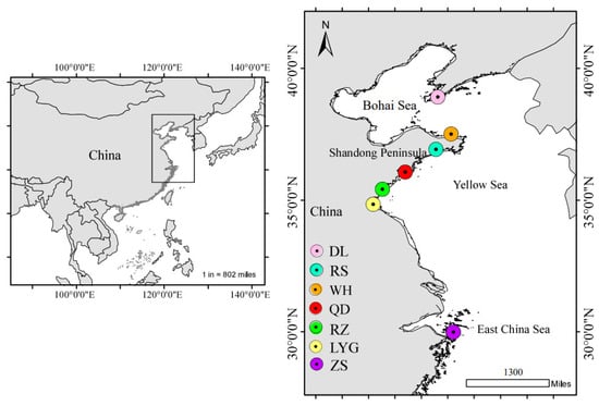 Sampling map for C. myriaster populations, reprinted from [24]. (DL, WH, RS, QD, RZ, LYG, and ZS stand for the Dalian, Weihai, Rushan, Qingdao, Rizhao, Lianyungang, and Zhoushan populations, respectively.).
