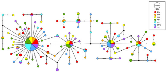 Detailed genetic diversity information for each population is shown in Table 2. Hd values ranged from 0.8133 to 0.9667, and π values ranged from 0.00279 to 0.00389, with average values of 0.9338 ± 0.013 and 0.00354 ± 0.0020, respectively. The highest genetic diversity was found in population DL among all studied populations (h = 30, Hd = 0.9667 ± 0.019, and π = 0.00389 ± 0.0022). Population RZ exhibited the lowest genetic diversity (h = 14, Hd = 0.8133 ± 0.080, and π = 0.00279 ± 0.0017).