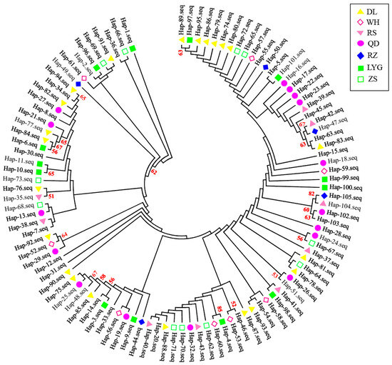 There were 105 haplotypes defined in seven populations, and all were achieved in GenBank under accession numbers PQ317984–PQ318088. Among these haplotypes, only one haplotype (Hap 5) with the highest frequency was detected in all populations. For the remaining ones, Hap 2 and Hap 8 were shared by six populations, Hap 20 was shared by five populations, Hap 14 was shared by four populations, and Hap 36 and Hap 46 were shared by three populations. A total of 14 haplotypes (Hap 7, Hap 12, Hap 15, Hap 30, Hap 31, Hap 33, Hap 34, Hap 45, Hap 48, Hap 51, Hap 54, Hap 55, Hap 63, and Hap 103) were shared by two populations. In addition, 84 population-specific haplotypes were identified, respectively, in populations DL (22), WH (8), RS (9), QD (16), RZ (5), LYG (13), and ZS (11) (Figure 2). No obvious correlation was found between haplotype and geographical location in the phylogenetic NJ tree (Figure 3).