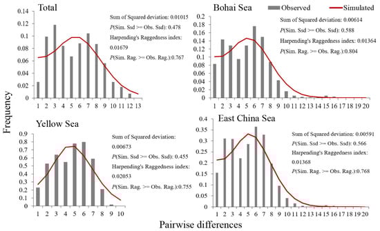 The DNA sequence information was utilized for Tajima’s D and Fu’s Fs tests to assess population expansion events under neutral conditions. In addition to the non-significantly negative Tajima’s D results for RZ (p = 0.077) and WH (p = 0.101), the other five populations possessed significant or highly significant negative values of Tajima’s D test. Further, the Fu’s Fs test results for all populations were extremely significantly negative, and the total Tajima’s D and Fu’s Fs test results were all negative values with high significance (Table 5). These results suggest that C. myriaster had experienced population selection or demographic expansion. The nucleotide mismatch distribution revealed a typically unimodal Poisson distribution with relatively small and statistically insignificant RI and SSD values (p > 0.05), indicating that the observed data did not statistically deviate from the demographic expansion model (Figure 4).
