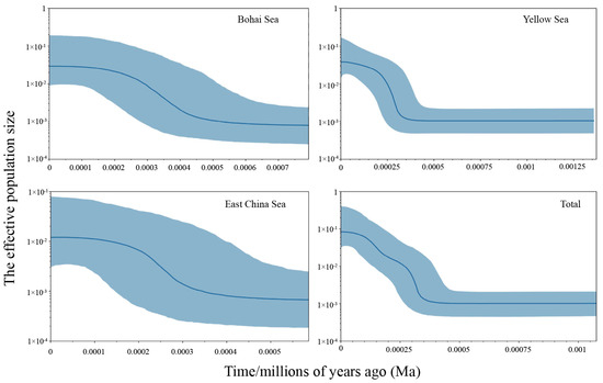 Using an average nucleotide mutation rate of 2.0% per million years for the Cyt b gene to estimate the population expansion time [53], with a generation time of 3.5 years [8], the overall expansion time of C. myriaster was estimated to be about 0.169–0.207 million years ago (Ma), i.e., during the Pleistocene period. Bayesian skyline plots showed that the Ne of C. myriaster along the coasts of China has maintained a sustained and stable increase over the last few hundred years, and there was no considerable difference in population expansion times among populations (Figure 5).