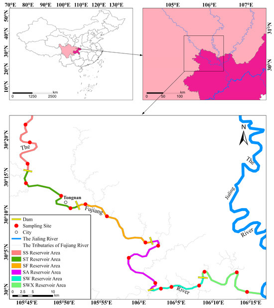 The Fujiang River is located between 30°42′–33°03′ N and 103°45′–105°43′ E, with a total length of 668 km (Figure 1). The study area encompasses the downstream Chongqing section of the Fujiang River, which has been divided into six isolated river segments by the construction of five dams (Figure 1). These segments include the Shuangjiang (SS) reservoir, Tongnan (ST) reservoir, Fujinba (SF) reservoir, Anju (SA) reservoir, Weituo (SW) reservoir, and the Weituo River confluence section (SWX). In each reservoir, three sampling sites were established, located at the upstream, midstream, and downstream areas of the reservoir. In total, 18 sampling sites were set up for this study (Figure 1, Table S1).