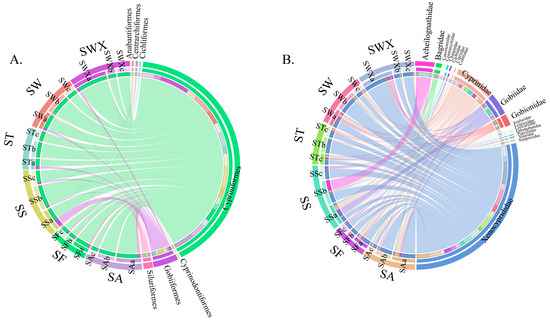 Circos species relationship map for each sample, showing species composition: (A) represents species composition at the order level, and (B) represents species composition at the family level; a represents the fish collected in May; b represents the fish collected in September; c represents the fish collected in January.