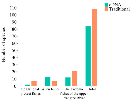 Over the past 20 years, traditional methods have identified 108 fish species belonging to 7 orders, 18 families, and 74 genera (Table S2). A comparison between eDNA and traditional survey results showed that both methods detected 43 species, with a coverage rate of 39.81% (Figure 3). Both approaches consistently identified a higher abundance of Cyprinidae, Bagridae, and Cobitidae species. However, the number of nationally protected species and endemic species of the upper Yangtze River detected by the eDNA method was lower than that detected by the traditional method in the past, while the number of alien species detected was higher with the eDNA method (Figure 3).