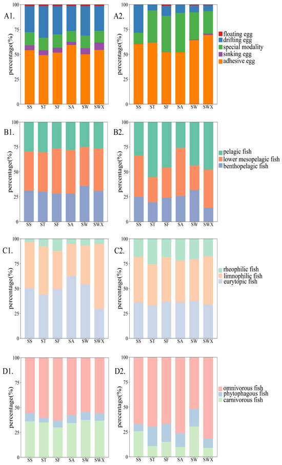 The composition of the ecological types in each sampling section: (A1) spawning types based on the number of species; (B1) habitat water layer based on the number of species; (C1) habitat water velocity based on the number of species; (D1) food type based on the number of species; (A2) spawning types based on the number of relative abundance of sequences; (B2) habitat water layer based on the number of relative abundance of sequences; (C2) habitat water velocity based on the number of relative abundance of sequences; (D2) food type based on the number of relative abundance of sequences.