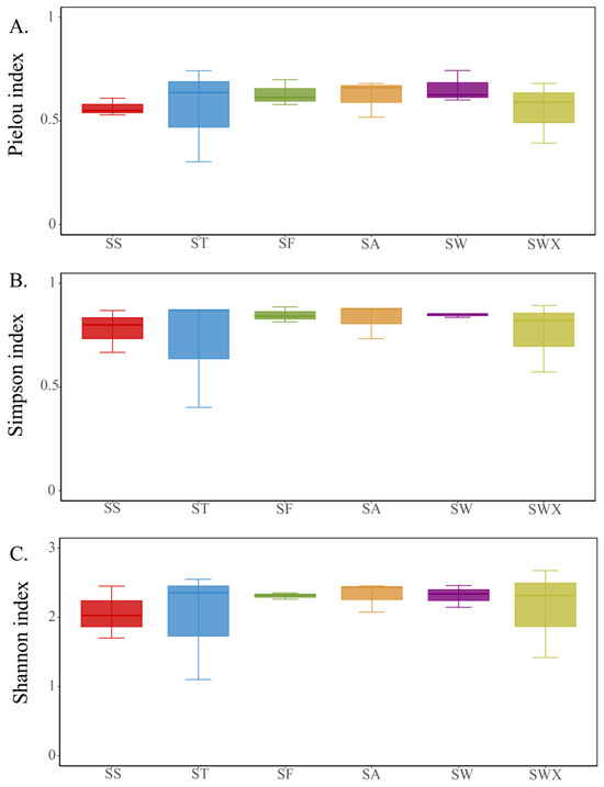 The boxplots showing the alpha diversity index for each sampling section: (A) is the Pielou index; (B) is the Simpson index; (C) is the Shannon index.