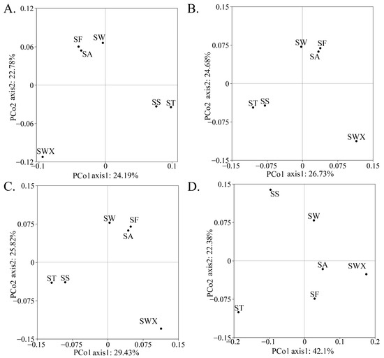 The PCoA for the beta diversity indexes: (A) is the Sørensen index (βsor); (B) is the Jaccard similarity index; (C) is the richness (β-rich) components of the Sørensen index; (D) is the turnover (β−3) components of the Sørensen index.