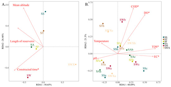 In the redundancy analysis (RDA) of stable environmental factors (Figure 7A), the mean attitude and length of the reservoirs had some effect on SA and ST, but had a minor impact on SS, and these effects were not statistically significant (p > 0.05). In contrast, the reservoir formation time had a significant impact on SF, SW, and SA, especially on the structure of the fish community, which was statistically significant (p = 0.009).