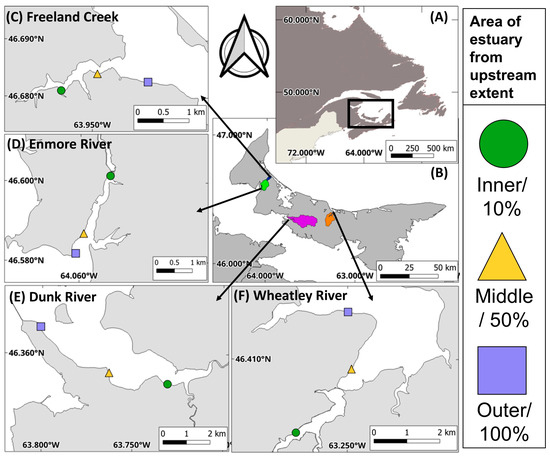For this study, the upper estuarine boundaries were defined at 0.5 PSU [6,21]. Geographic features at a point where fresh and salt water were fully mixed marked the estuarine area’s lower boundaries (Figure 1C–F). Each estuary was divided into three stations based on the estuary’s surface area: 10% of total surface area (closest to the river/upper/inner estuary), 50% of total surface area (middle of the estuary), and 100% of total surface area (closest to the ocean/outer estuary). Five to six sampling sites were established at the seaward boundary of each station (Figure 1C–F). The inner station (19–27 PSU) tends to be the site most impacted by eutrophication on PEI and is often dominated by Ulva [21]. In contrast, the middle and outer stations (25–30 PSU) tend to be more likely to have Zostera or bare substrate.
