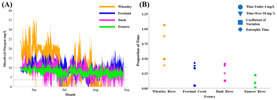 (A) Summer dissolved oxygen profile for the four estuaries’ inner region (10% of surface area) across Prince Edward Island, Canada, in the summer of 2021. The area between supersaturation (>10 mg/L) and hypoxia (<4 mg/L), as represented by the black dashed lines, indicates normoxic conditions. (B) Mean values of the proportion of time under 4 mg/L (circles), over 10 mg/L (triangles), the coefficient of variation (squares), and for eutrophic time (diamonds) for all dissolved oxygen values throughout the summer of 2021.