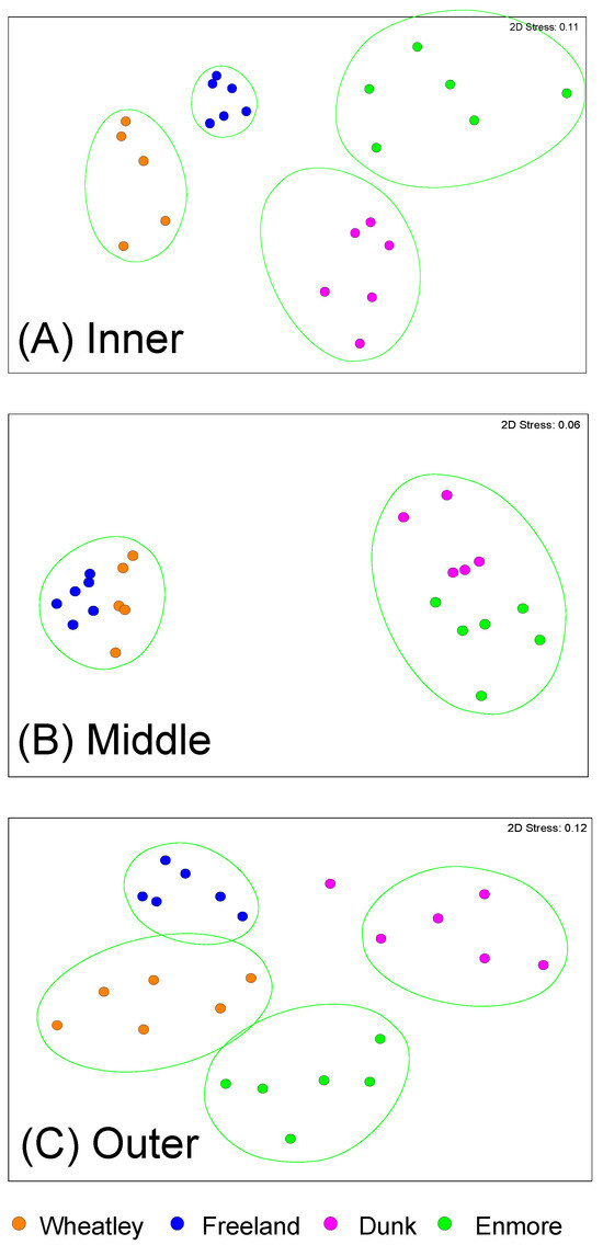 nMDS plots comparing the August 2021 multivariate data cloud of all four estuaries for the (A) inner station, (B) middle station, and (C) outer station. Green ellipses indicate significantly similar groupings as indicated by the SIMPROF test.