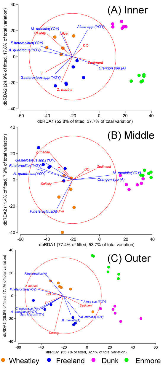 Distance-based linear models (DISTLMs) using all estuaries were performed separately on each of the three spatial areas. The relationships of environmental parameters measured when the seine haul was made, temperature, DO, salinity, % coverage of Ulva, % coverage of Z. marina, and % coverage of sediment were evaluated. Deviations from normality in environmental variables were improved by logarithmic transformation, and all environmental data were normalized prior to multivariate analyses. The variation in the fish communities observed was evaluated using marginal tests for statistical significance and the Bayesian Information Criteria (BIC) to evaluate the best model, which penalizes for higher numbers of explanatory variables. Distance-based redundancy analysis (dbRDA) was used to visualize the relationships.