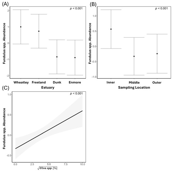 GAM-estimated effects of estuary, station, and measured environmental parameters on the total abundance of Fundulus spp. (A) Estuary effect on the relative mean abundance of Fundulus spp. caught through June and August in 2021 (n = 36–51). (B) Stations’ relative effect on the relative mean abundance of Fundulus spp. caught through June and August 2021 (n = 12–18). (C) Relationship between relative Fundulus spp. abundance and Ulva species % coverage at all estuaries sampled through August 2020, and June and August 2021 (n = 186). Solid black lines indicate mean effect, while light grey or bars denote a 95% credible range.