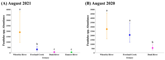 Mean Fundulus spp. abundances per beach seine haul (n = 5–6) at only the inner region within each estuary in (A) August 2021 and (B) August 2020. Error bars represent upper and lower 95% confidence intervals. All means and error bars were back transformed from their natural logarithm. Significance was determined with separate one-factor ANOVAs for each year, followed by Tukey post-hoc comparisons (a,b,c).