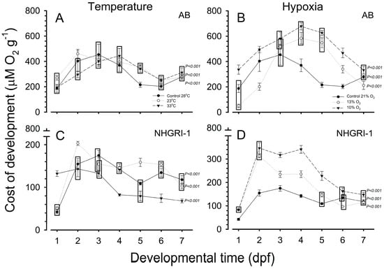 Cost of development (CoD) of AB (A,B) and NHGRI–1 (C,D) zebrafish during temperature (A,C) and hypoxia (B,D) experiments. Boxes surround means that are not significantly different. p values to the right indicate significant differences for each experimental group across time. n = 10 for AB fish, n = 5 for NHGRI-1 fish in each endpoint.