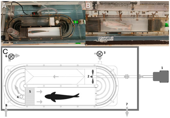 Swim tunnel. (A) Side view. (B) Top view. (C) Diagram of the swim tunnel: (1) Motor; (2) propeller; (3) pump to exchange water in the swim tunnel; (4) chimney for water outlet + fiber optic oxygen meter; (5) honeycomb (for laminar flow); (6) recirculation pump; (7) outlet from tank to water reservoir; (8) inlet to tank from water reservoir.