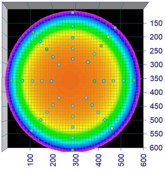 Screenshot, flow profile. The heat map illustrates the water velocity in the circular raceway as measured and regressed as a surface. The dots represent the 40 points that were measured with a flow probe and used to fit the flow profile in TableCurve3Dv4.