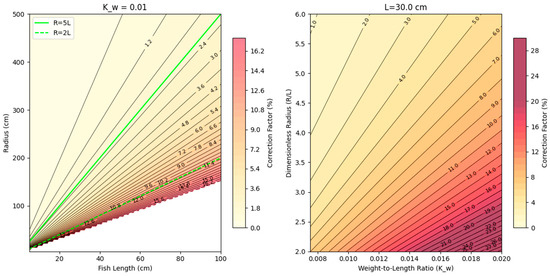 Correction factor for straight-line swimming. (Left): Correction factor for difference fish lengths (x) and turning radii (y); green lines represent R = 5*L and R = 2*L for reference. (Right): y-axis is the ratio of turning to fish length, and x-axis is the weight to length ratio; increasing numbers indicate a more plump fish—i.e., having more mass per length. Based on Equation (2).