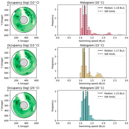 After the introduction to the swimming section in the circular raceway, the fish spent 10–60 min exploring the new environment and then settled into a preferred position. The fish carried on in the same position for most of the measuring period. Upref was determined for each thermal acclimation treatment group (10, 15, and 20 °C) (Figure 6), averaging volitional preferred swimming speeds of 1.18 ± 0.14, 1.17 ± 0.19, and 1.24 ± 0.15 BL s−1, ± SD, respectively (Table 2).