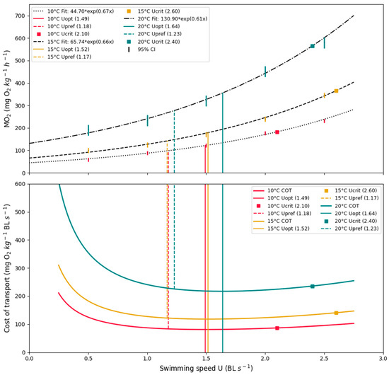 Furthermore, the Ucrit results for each treatment group (10, 15, and 20 °C) were 2.1 ± 0.35, 2.6 ± 0.05, and 2.4 ± 0.42 BL s−1, ± SD, respectively. Statistical analysis showed significant differences between groups (one-way ANOVA, p = 0.19). A further post-hoc (Tukey’s HSD) test showed a significant difference between treatment groups 10 °C and 15 °C, and treatment groups 10 °C and 20 °C (p = 0.009 and p = 0.049, respectively). All results from the swimming respirometry trials are presented in Table 2 and graphically illustrated in Figure 7.