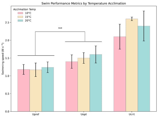 Comparison of swimming speed metrics. The plot depicts the average observed Upref, Uopt, and Ucrit for each acclimation temperature group. The whiskers are 1 SD, and colors represent the groups. The *** above the bars indicates a statistically significant (*** = p ≤ 0.001) difference between groups.