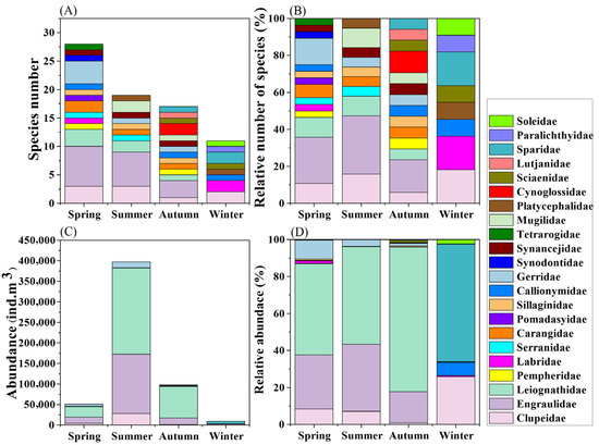 Species and abundance percentage of fish eggs in Daya Bay. (A) The number of fish egg species per season; (B) The proportion of species number of fish eggs in each season; (C) Abundance of eggs per season; (D) The proportion of the abundance of each fish egg in each season.