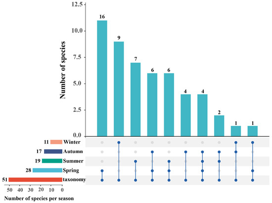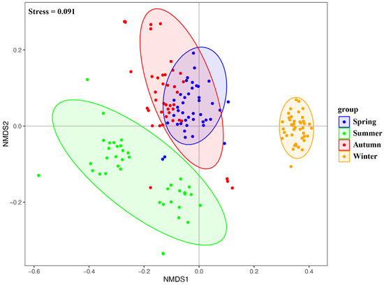 Significant differences were observed in diversity indices (H’, J’, d) across different seasons (Table 3). The Shannon–Wiener diversity index followed the order spring > winter > autumn > summer. However, the Pielou evenness index reached its peak in winter, followed by spring, autumn, and summer. Furthermore, the Margalef abundance index was significantly higher in spring compared to both summer, autumn, and winter (p < 0.001).
