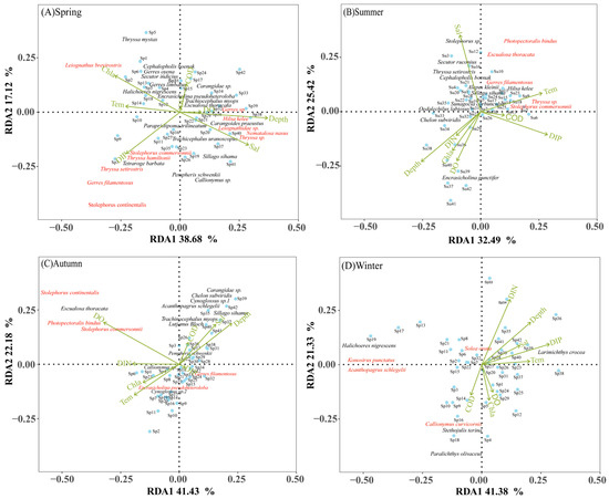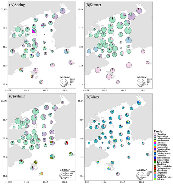 There were 11, 6, 5, and 5 dominant species in spring, summer, autumn, and winter, respectively (Table 2). These dominant species exhibited obvious seasonal changes. Specifically, Stolephorus commersonnii and Gerres filamentous emerged as the predominant species during spring, summer, and autumn. In spring, a total of 11 dominant species were recorded. Among them, Leiognathus sp., Leiognathus brevirostris, and Stolephorus continentalis constituted the primary dominant species. During summer, Stolephorus commersonnii and Photopectoralis bindus ranked as the most prevalent species. Three dominant species were observed: Thryssa mystax, Escualosa thoracata, and Sardinella sp. Similarly to summer, both Stolephorus commersonnii and Photopectoralis bindus remained the leading dominant species in autumn. In winter, there was a notable shift, with five dominant species emerging. Acanthopagrus schlegelii and Nematalosa japonica became prominent. The proportion of these dominant species relative to total abundance was recorded at 95.73%, 93.87%, 81.34%, and 98.7% for spring, summer, autumn, and winter, respectively.
