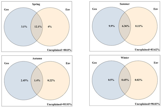 Venn diagram illustrating variation partitioning, depicting the contributions of spatial and environmental variables to the variation observed in fish egg communities. The values represent the percentage of variation accounted for by each component (Geo, geographical distance; Env, environmental factors).
