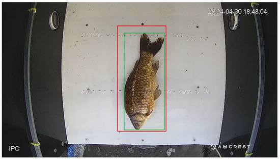 An illustration of IoU on a sample annotation of a fish. In this example, the red box represents the predicted bounding box and the green box represents the true bounding box. In this case, px and px, so .